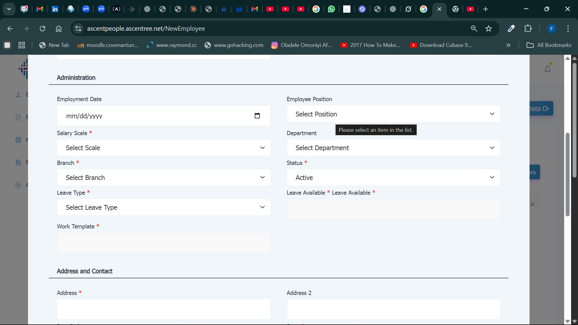Set the Employment Date, Select the Employee Position, Salary scale, Department, Branch, Employment Status, Leave Type, the leave available and work template are auto populated.