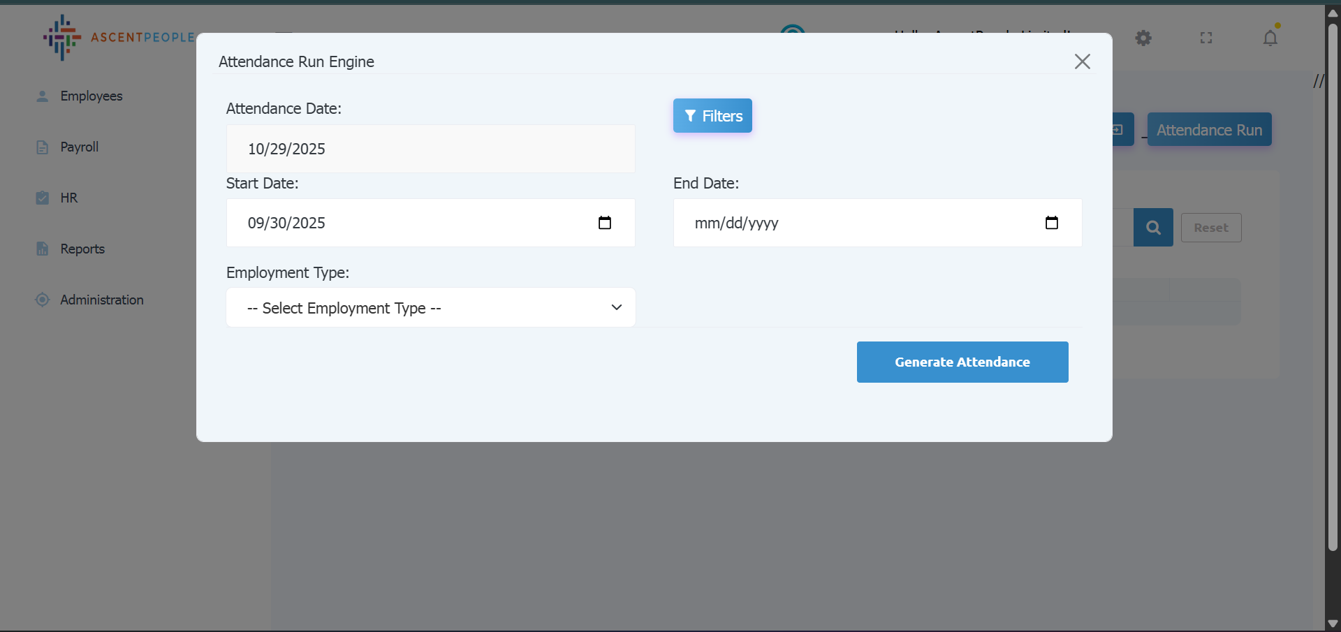 Attendance date is the set as the current date, you can set filters (branch, department, position, employee), fill in the Start date, End date and select the employment type, then click generate attendance.