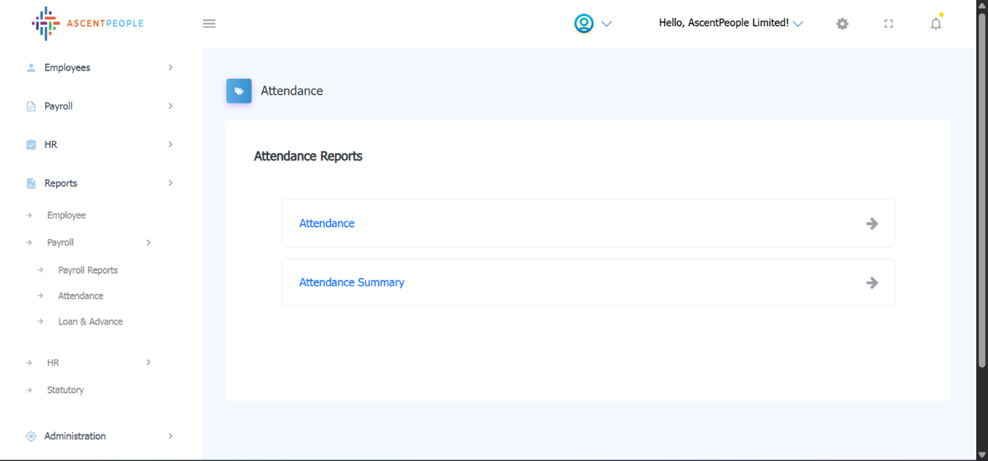These are the attendance reports (attendance and attendance summary reports).There are the payroll reports (Payroll Schedule, Payroll Summary and Detailed Payroll Report).