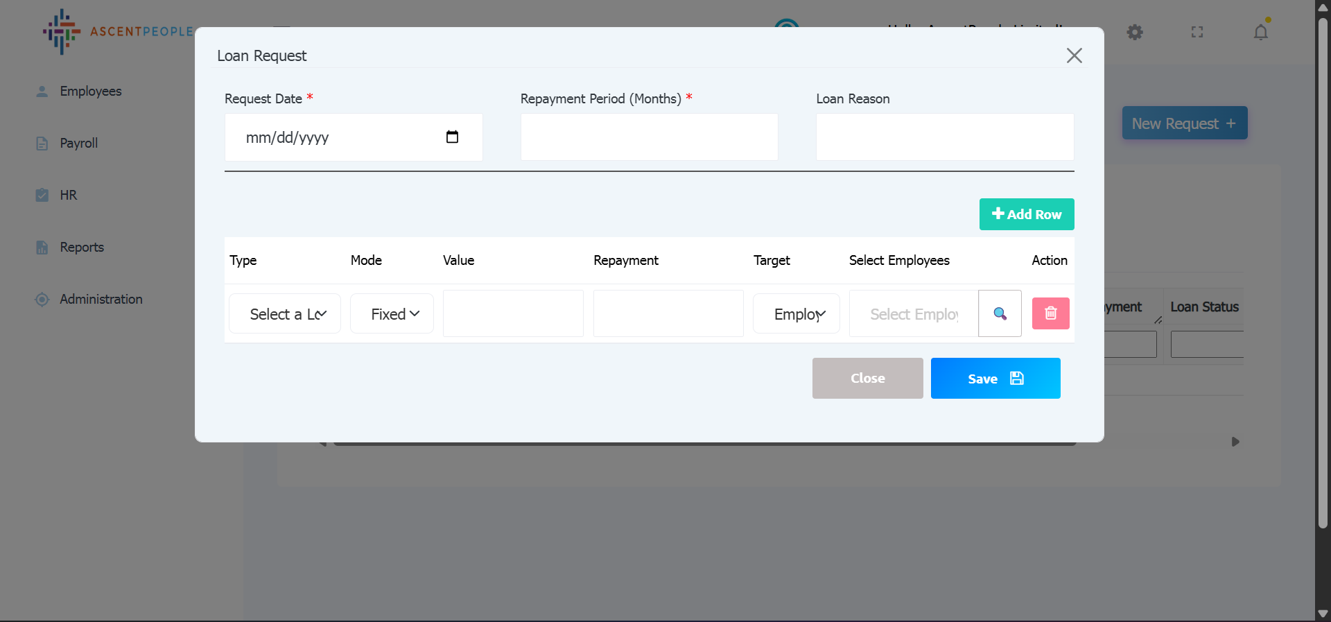 Set the Request date, Repayment Period (Months), Loan reason. Then on the table: Select the loan type, the mode (if fixed then input the amount, if percentage is selected then the percentage value should be set and applicable paycodes should be selected as well), Repayment, the target for those loan (branch, department, employee), the employees you want the adjustment applied to, Multiple rows can be added depending on how many loans in the batch. Then click save.