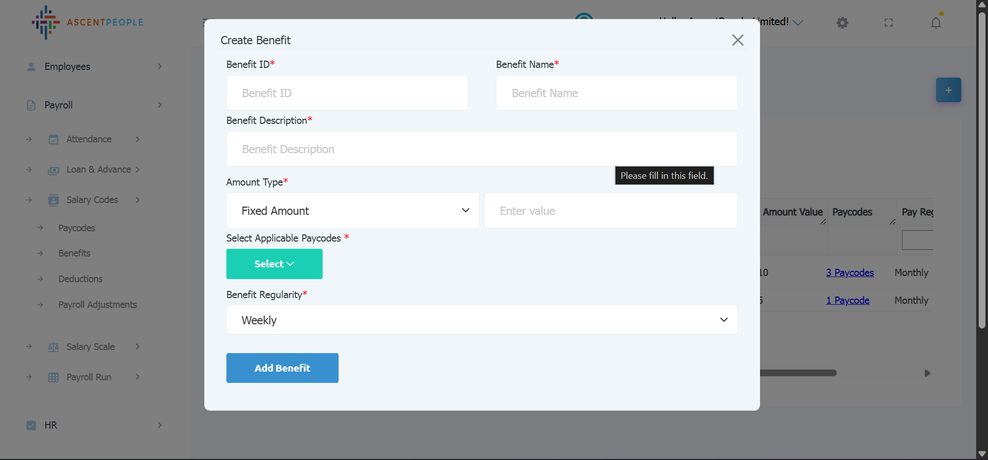 Enter the Benefit ID, Benefit Name, Description, Amount type (if fixed then input the amount, if percentage is selected then the percentage value should be set and applicable paycodes should be set as well), select benefit regularity, then create the benefit.