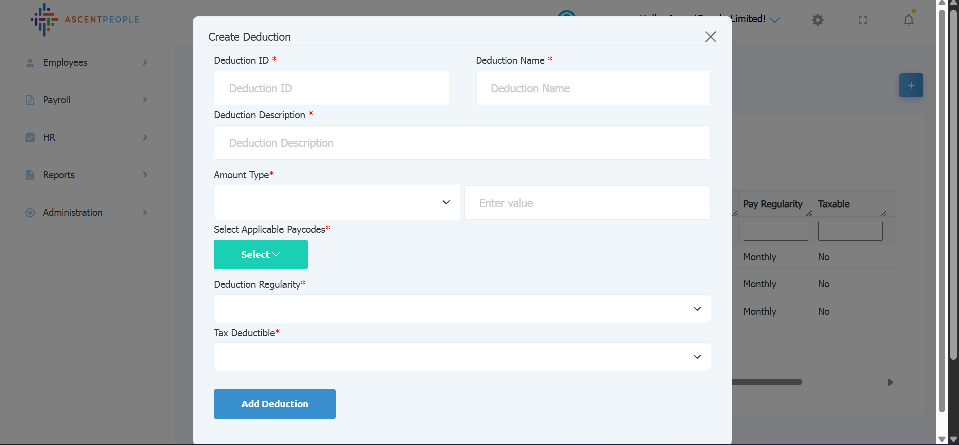 Enter the Deduction ID, Deduction Name, Description, Amount type (if fixed then input the amount, if percentage is selected then the percentage value should be set and applicable paycodes should be set as well), select deduction regularity, select yes if tax deductible if not tax deductible select no, then create the deduction.