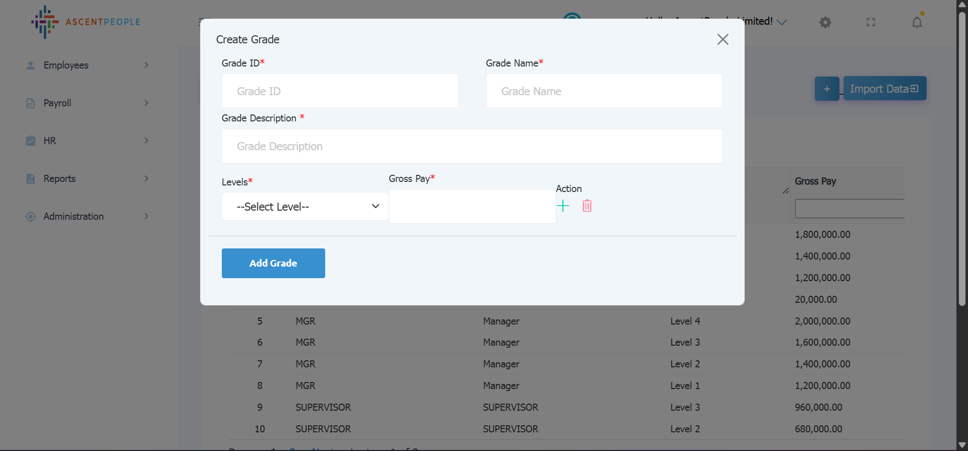 Enter Grade ID, Grade Name, Description, select level and the gross pay (multiple levels with the respective gross pay can be added with the plus icon), Then add the new grade.