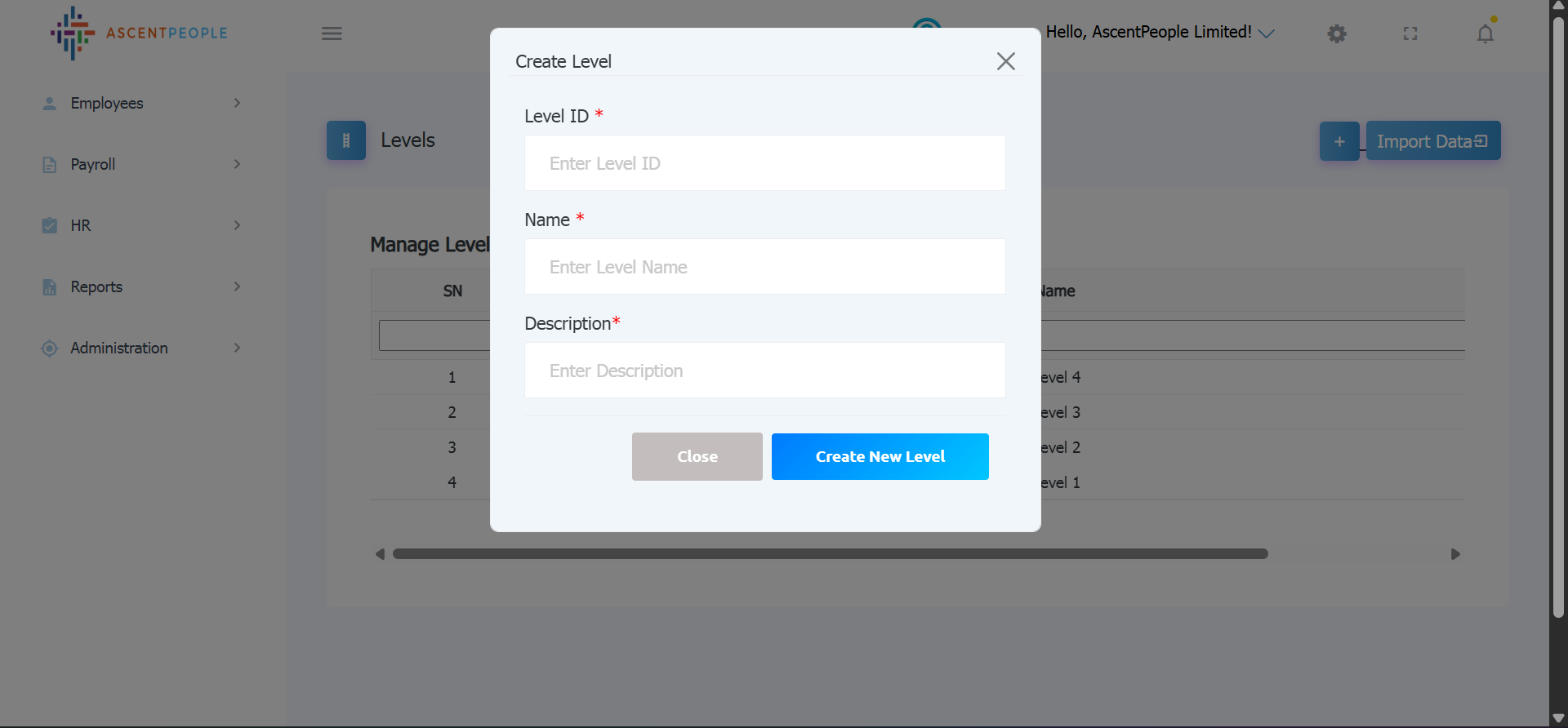 Enter the Level ID, Level Name, Description, then create the level.