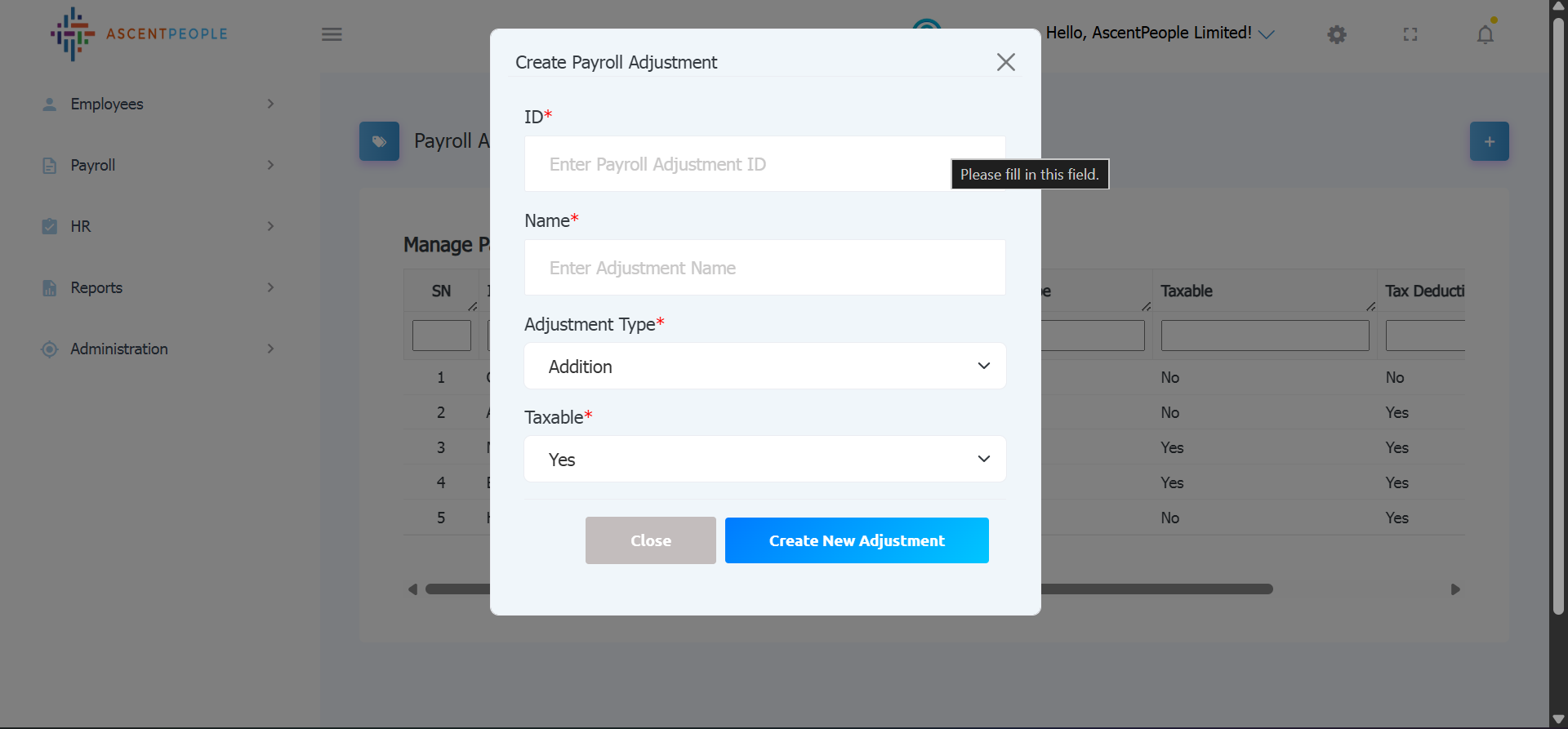 Enter the Adjustment ID, Adjustment Name, select the adjustment type, select yes is the adjustment is taxable and no if not taxable, then create the payroll adjustment.