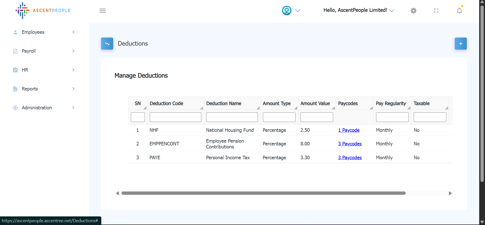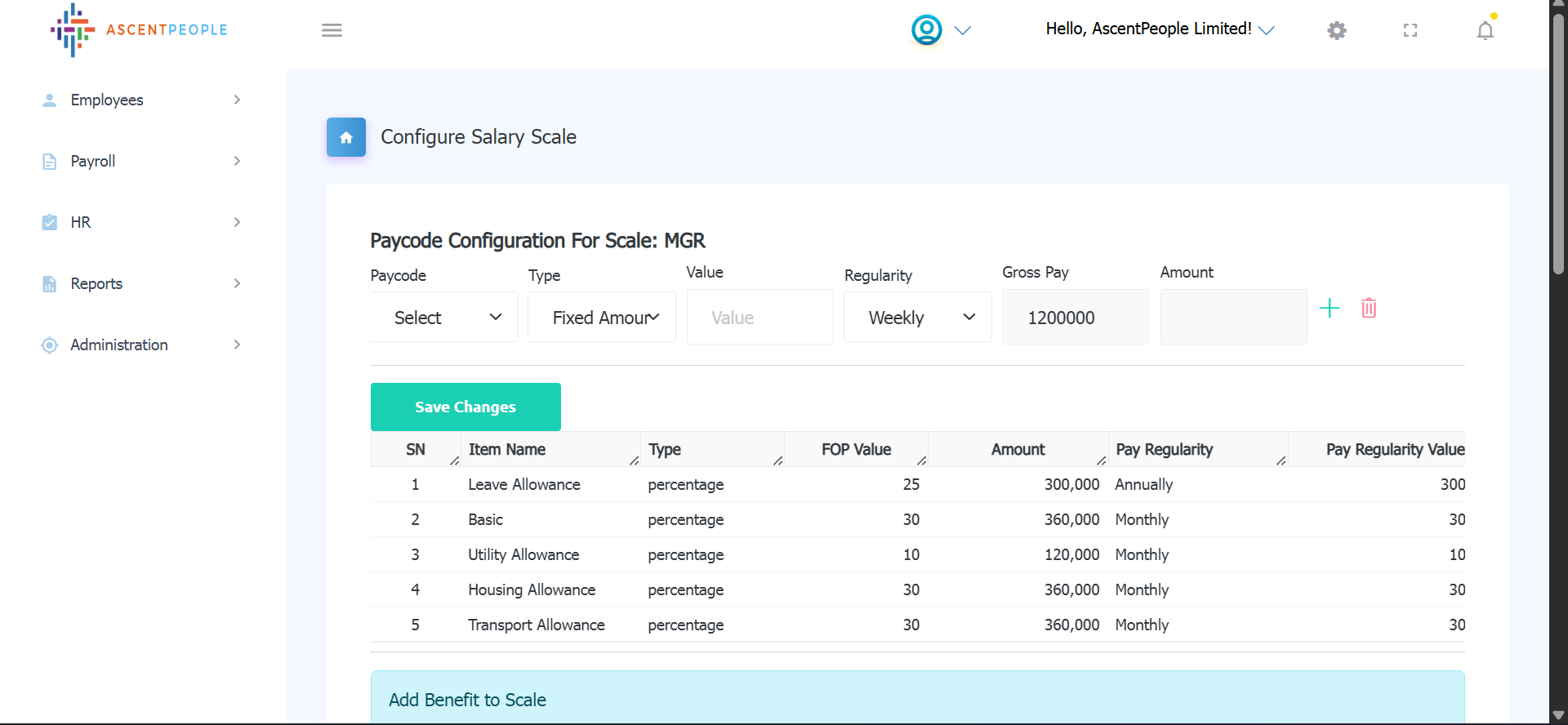 Select the paycode the amount type (if fixed then input the amount, if percentage is selected then the percentage value should be set and applicable paycodes should be selected as well), select the regularity, Gross pay (auto input from the grade table), Amount (Auto calculated from the previous selection). Multiple paycodes can be configured and saved or paycodes can be configured one at a time.