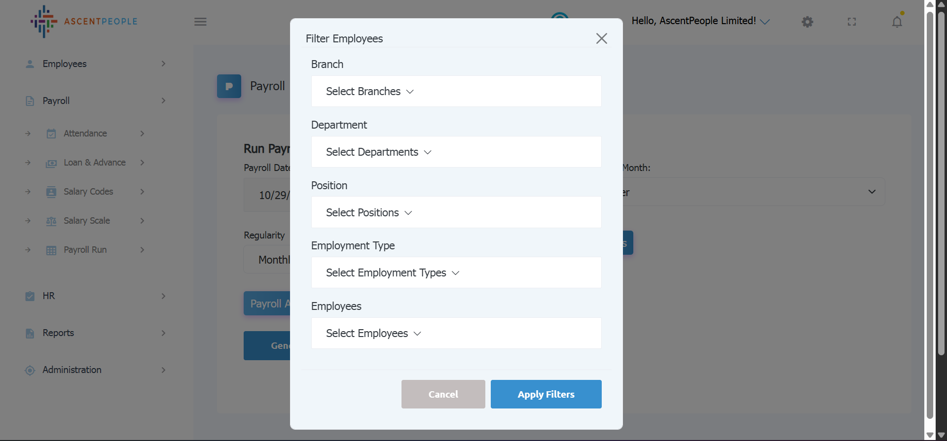 Filter for the criteria you want to generate payroll (Branch, Department, Position, Employment type, Employees) for and then click on apply filters to add the filter before payroll generation.