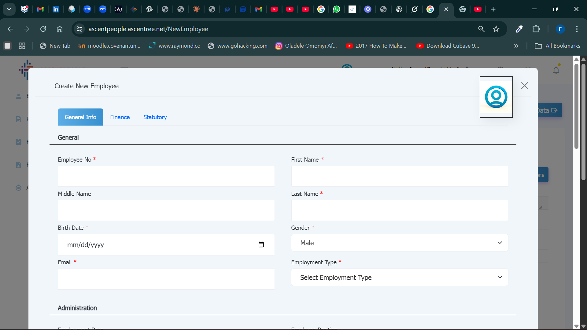 Enter the Employee No, First Name, Middle Name, Last Name, Birth Date, Gender, Email, Select the employment type.