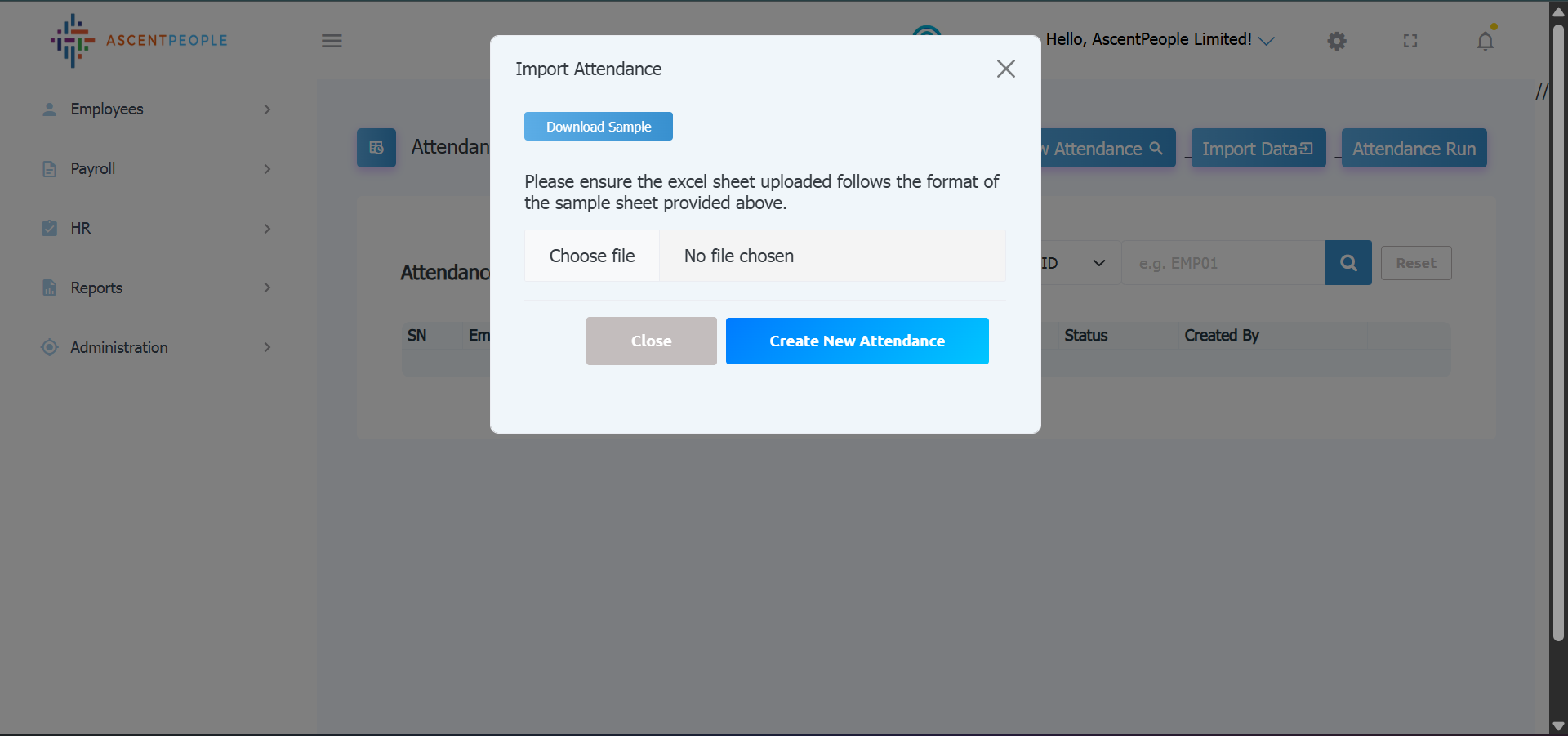 Download the sample file and add the attendance you want to import in the downloaded file format then upload the attendance.