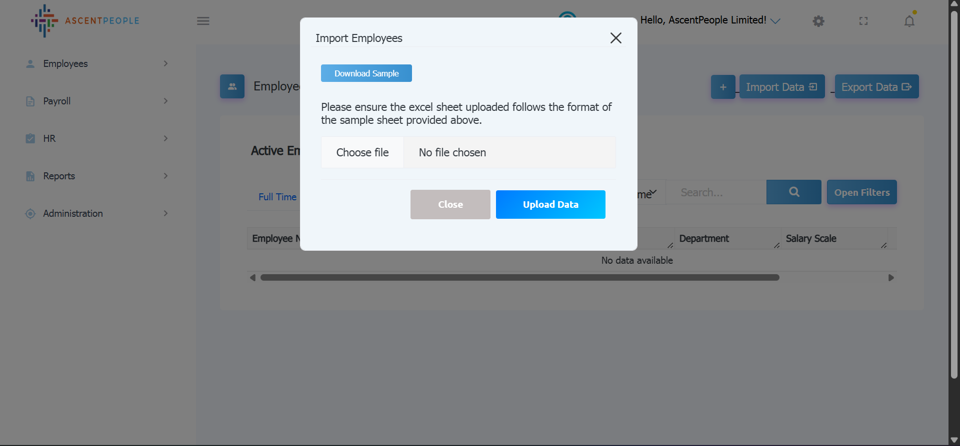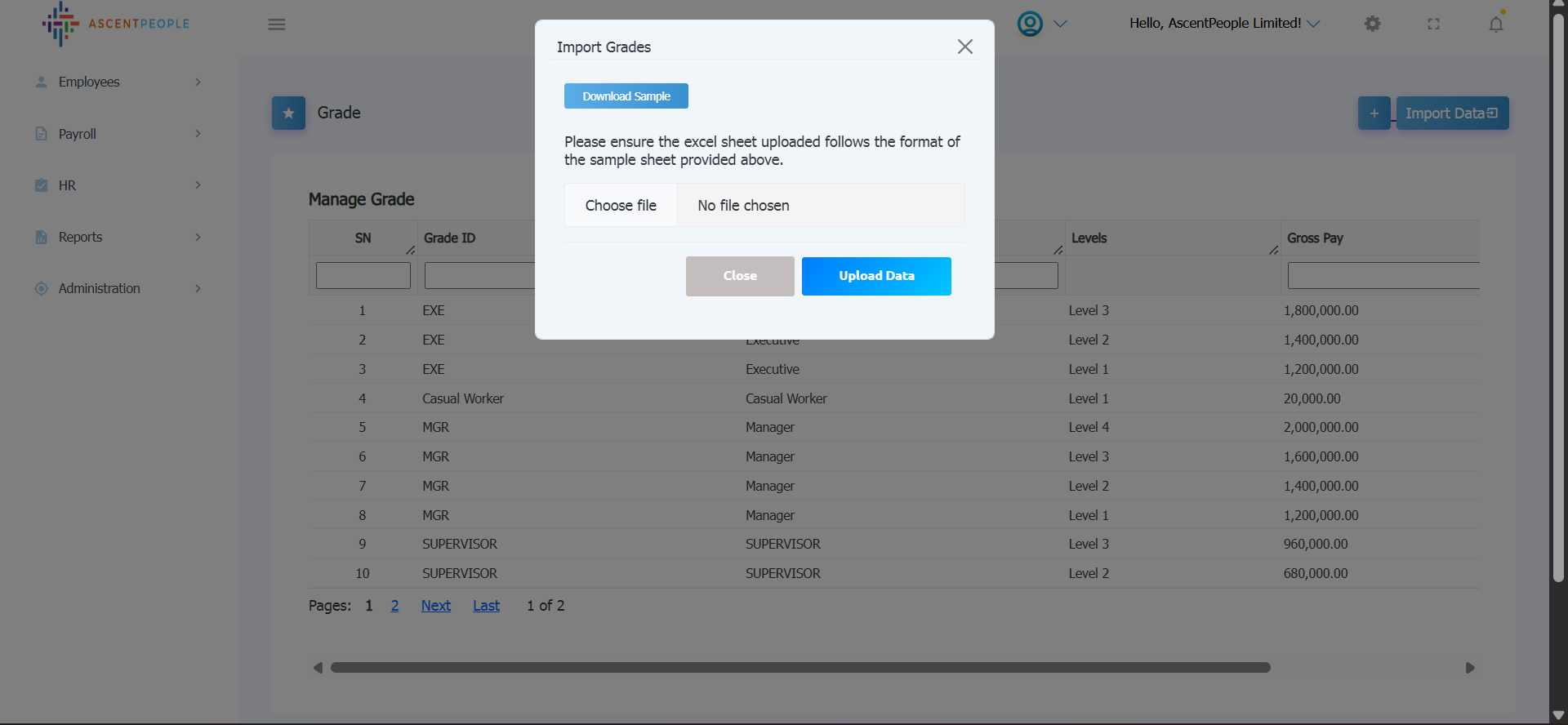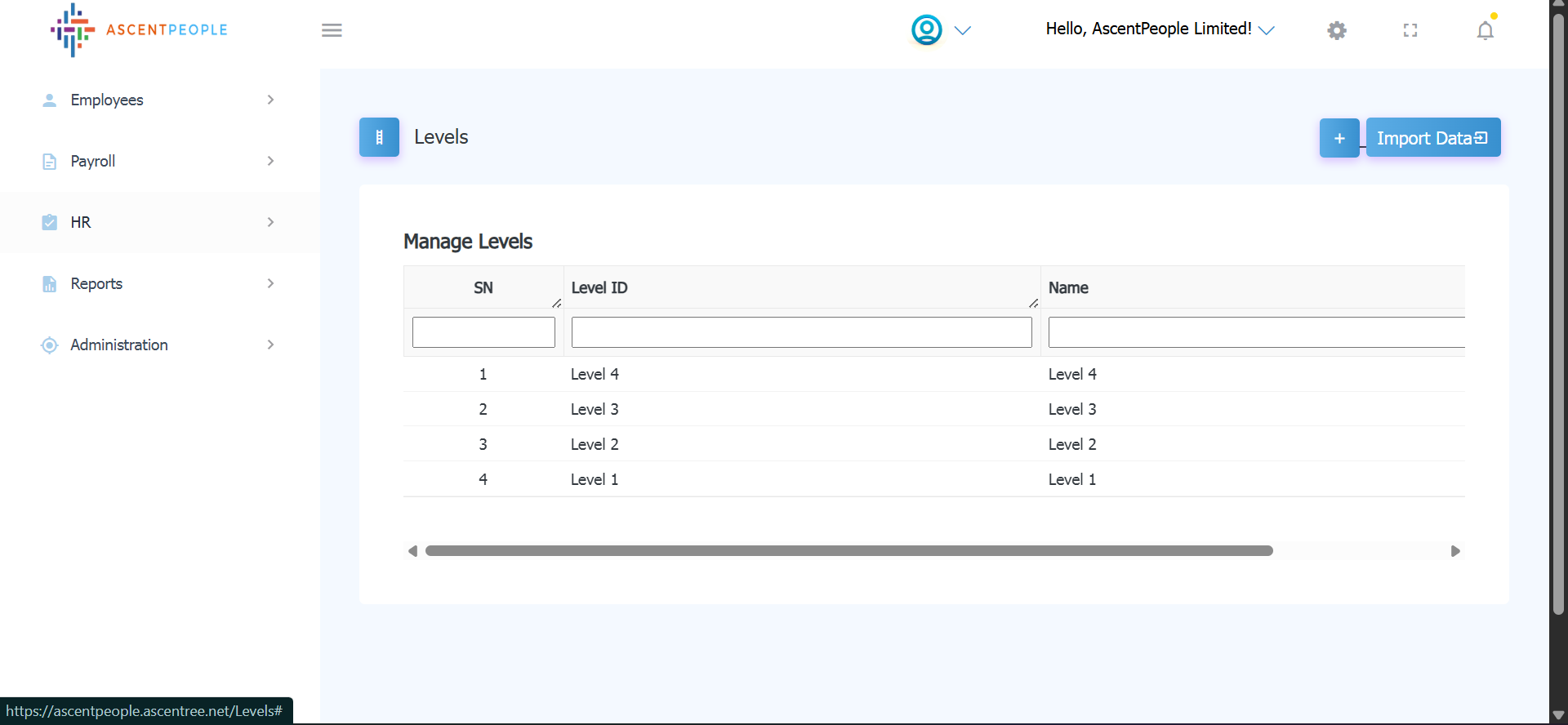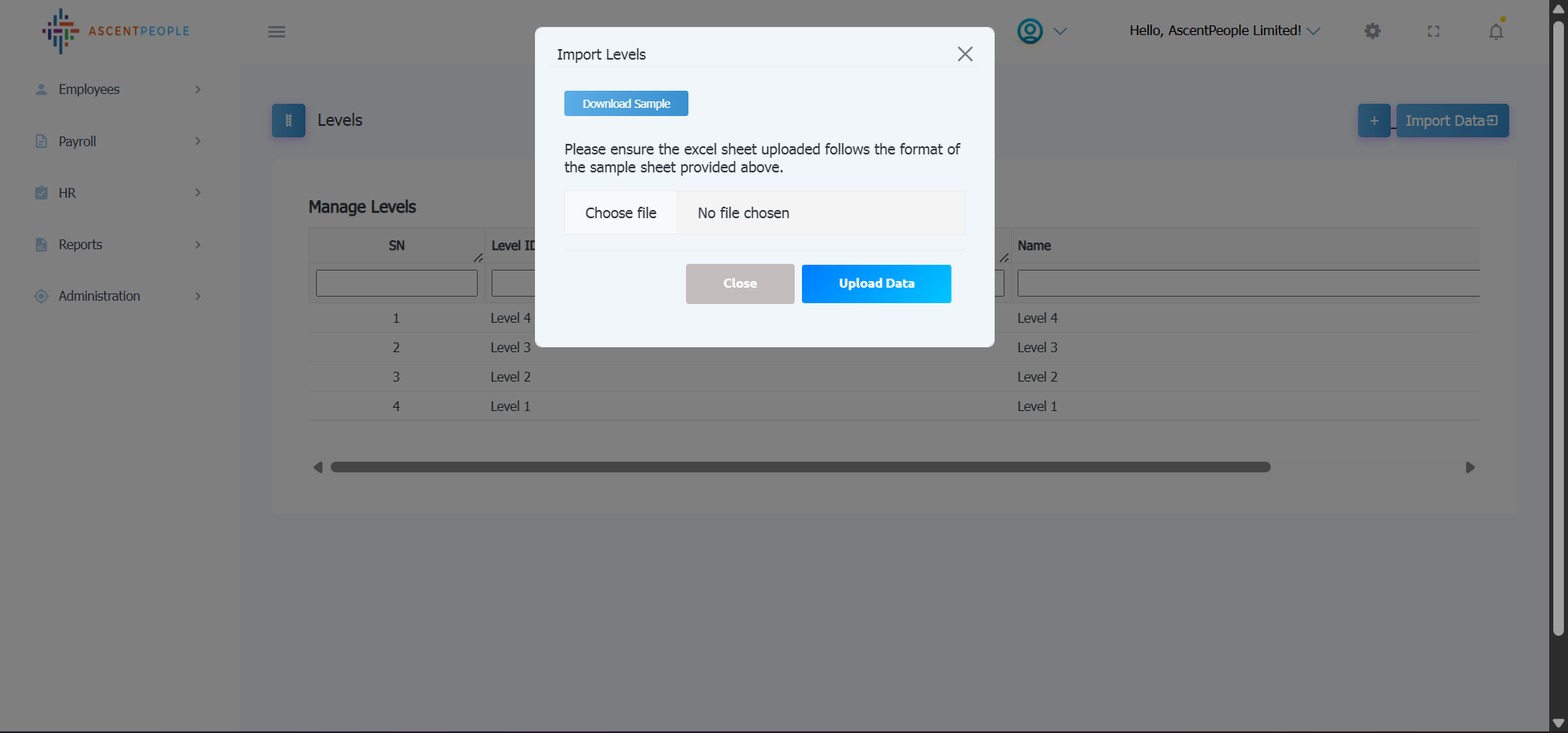 Download the sample file and add the employee you want to import in the downloaded file format then upload the level(s).