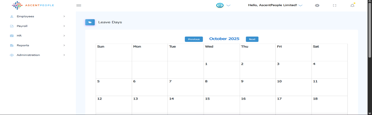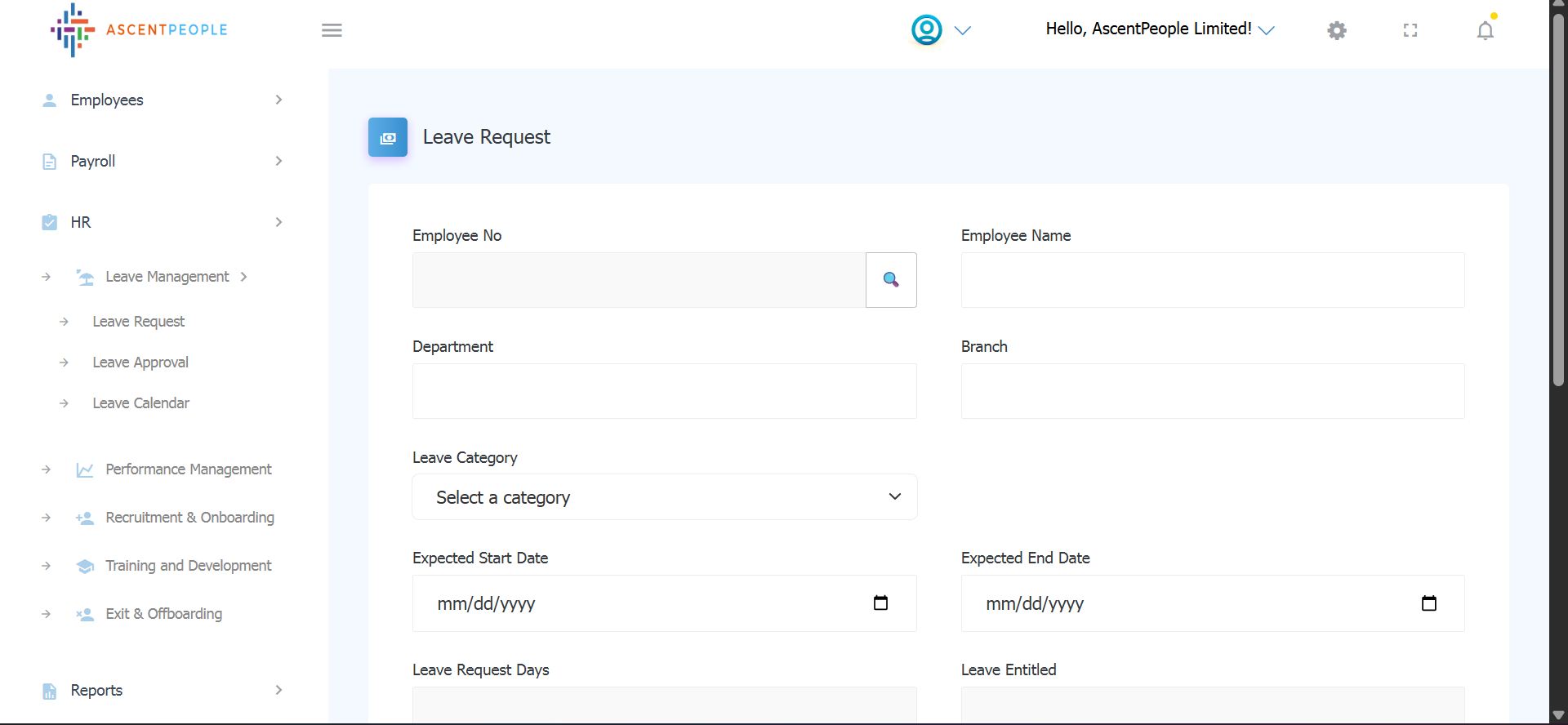 Once Employee No is set, Employee Name, Department, Branch are auto populated. Select the Leave Category, Expected start date and Expected end date, Leave Request days, then the following are auto filled (leave entitled, leave utilized and leave available), Type the leave reason, Accrual type, then submit the request.