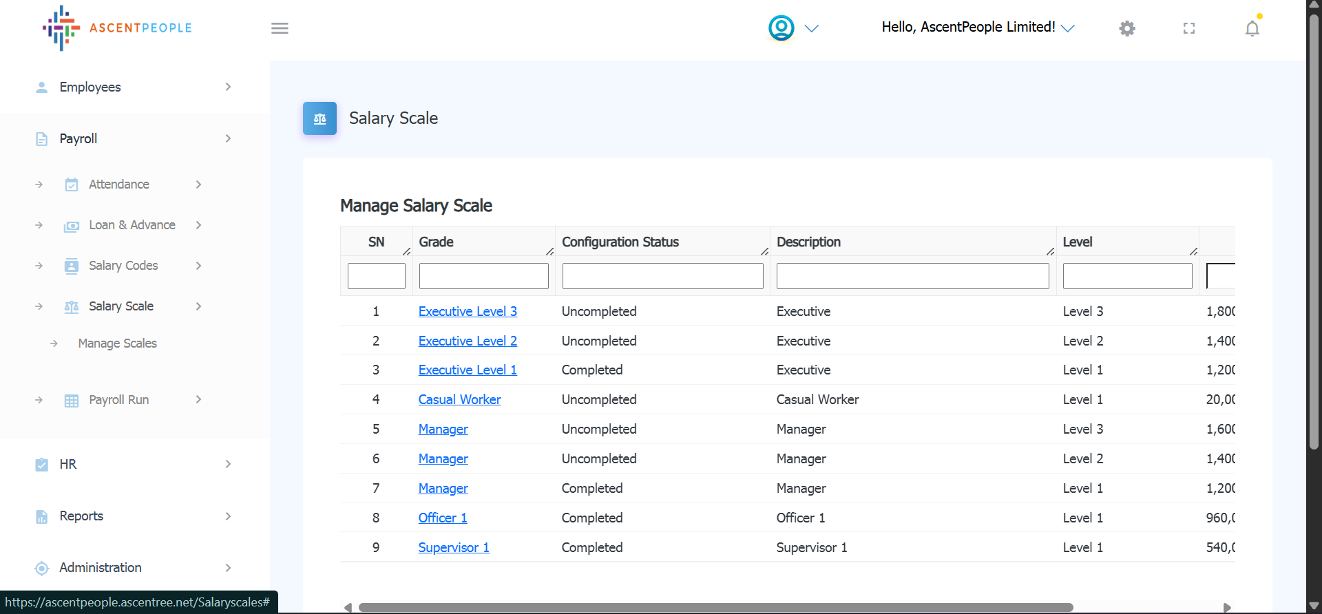 i. To configure a salary scale, on the grade column click on the scale you want to configure.