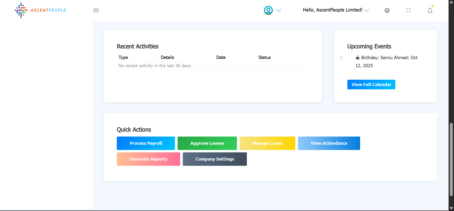 The first page the users sees is the dashboard which gives an overview of the company and actions to different modules relevant to the user.